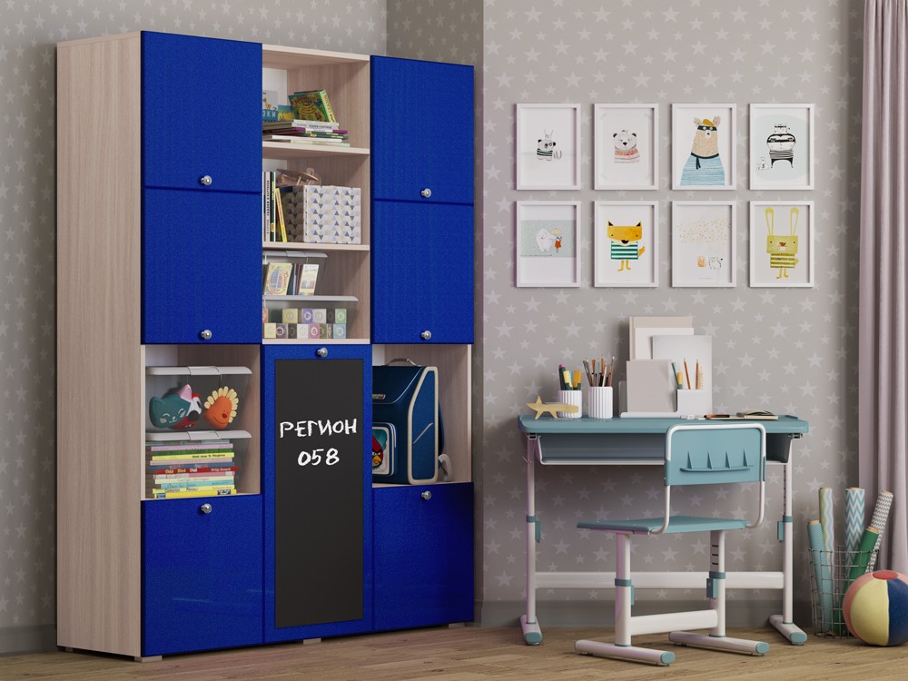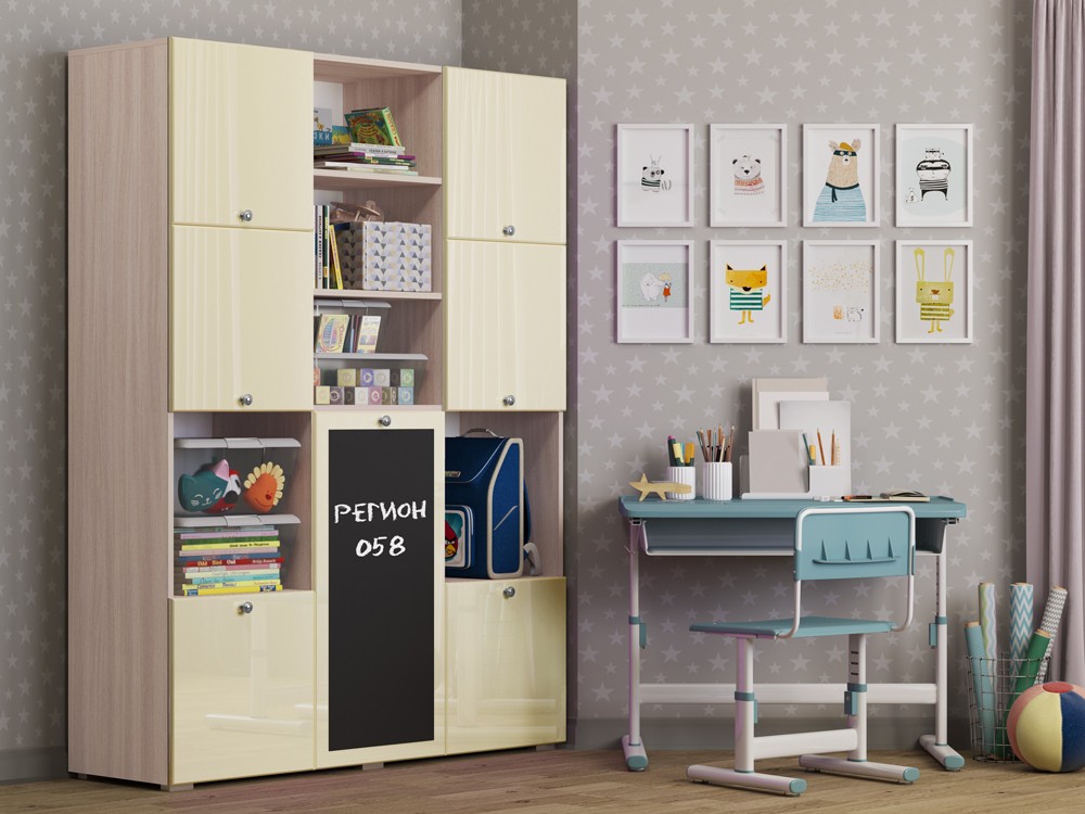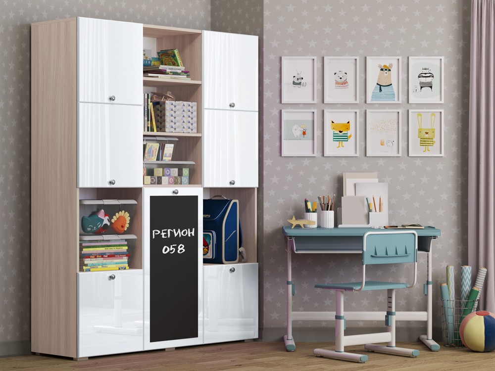 Необычный дизайн, хорошая вместимость шкафа, вешало для детской одежды, завершают образ изящные ручки-кнопки, которые не только красиво смотрятся в интерьере, но и отличаются удобством, долговечностью, безопасностью. Но главной и самой яркой изюминкой шкафа Юнга-11 служит доска для рисования. На ней можно рисовать как мелом, так и специальными маркерами, что позволит Вашему ребенку развивать свое творчество.