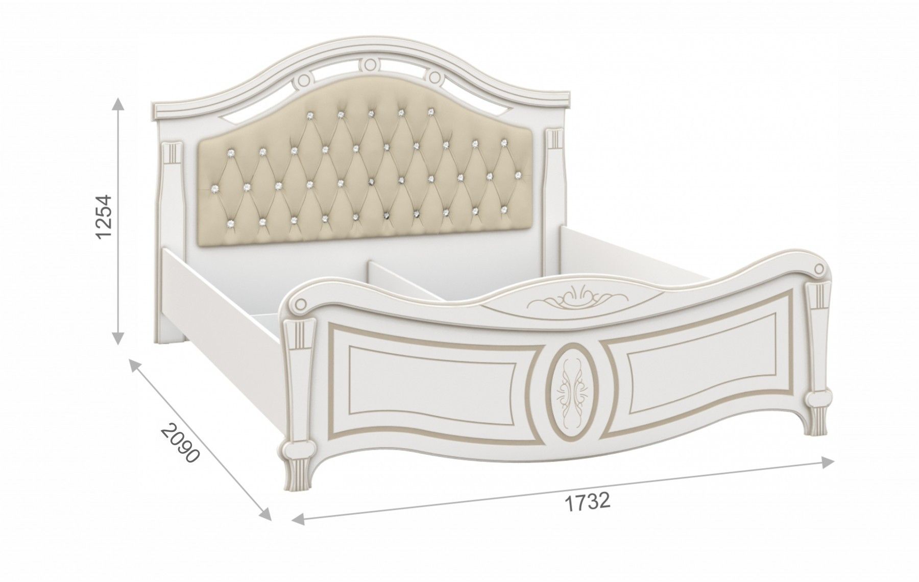 • Кровать: Ширина 1732 мм х Глубина 2090 мм x Высота 1254 мм/ Спальное место 1600 x 2000мм)