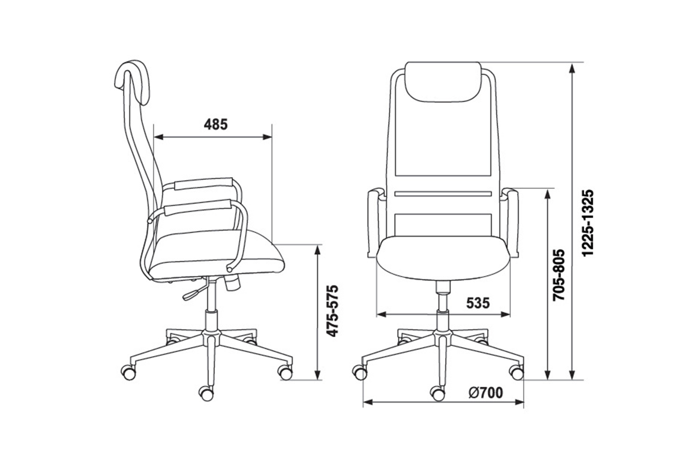 Диаметр колес - 5 см. Высота сиденья - 57.5 см. Высота с подлокотниками - 80.5 см. Ширина сиденья - 53.5 см. Глубина сиденья - 48.5 см. Материал колес - с накладкой PU. Материал обивки - спинка: сетчатая ткань / искусственная кожа (подголовник) сиденье: сетчатая ткань. Механизм качания с регулировкой под вес и фиксацией в вертикальном положении. Подлокотники металлические хромированные с накладками из ткани. Крестовина - хромированная.